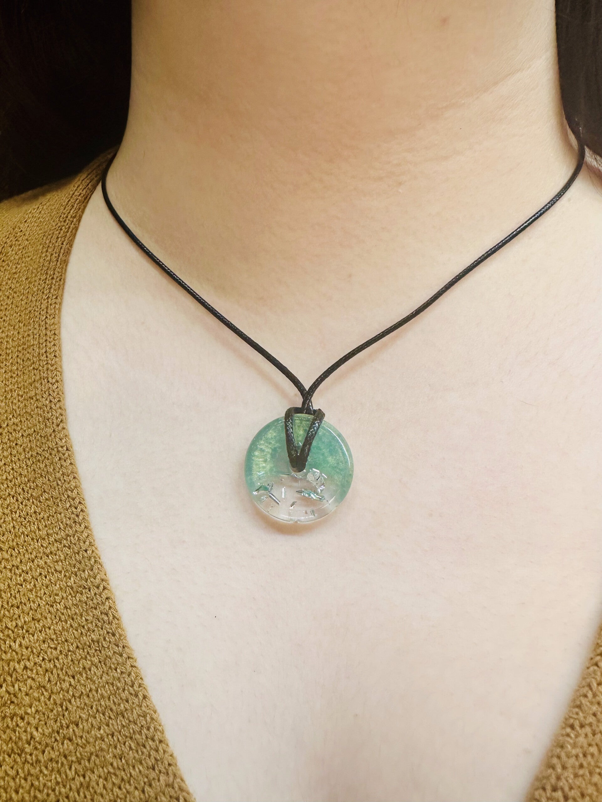 Collier élégant avec pendentif en résine époxy dans des teintes profondes de vert et d’argenté. Le pendentif capte la lumière et ajoute une touche moderne et mystérieuse à l'ensemble. L'association du vert intense et du argenté crée un contraste fascinant, parfait pour compléter une tenue élégante ou donner du caractère à un look quotidien. Ce collier est un choix idéal pour les amateurs de bijoux recherchant une pièce originale.